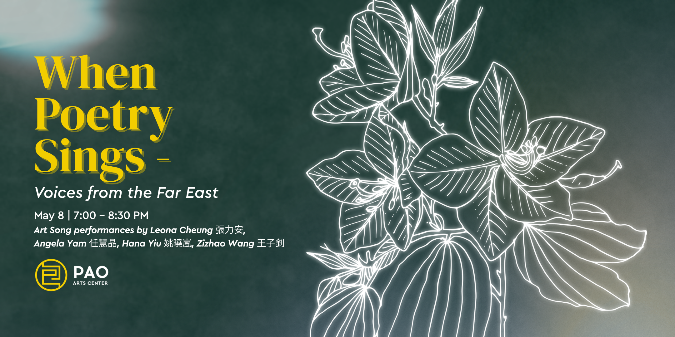 Join Pao Arts Center for an evening of music and poetry. When Poetry Sings seeks to illuminate the intersection of traditions through art songs. Curated by collaborative pianist Leona Cheung, this program presents settings of Chinese poetry from composers around the world.