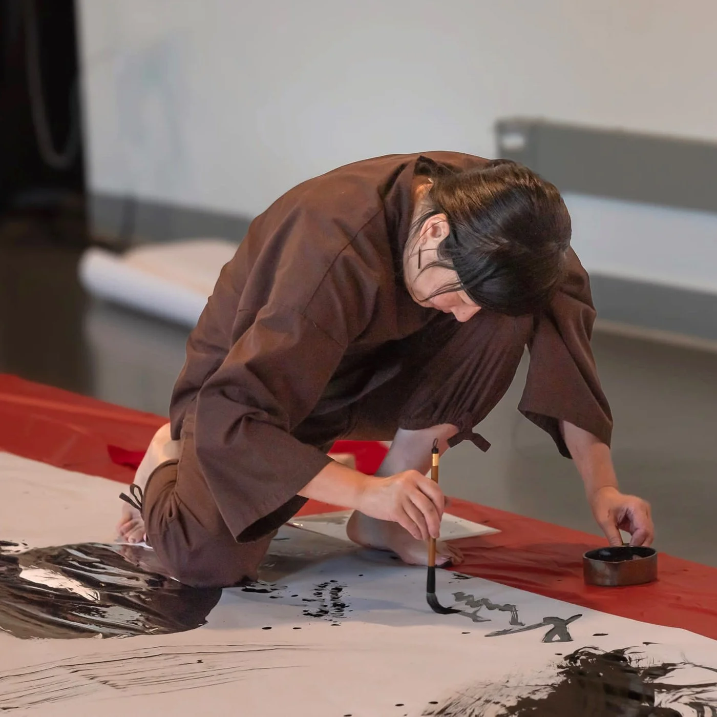Michiko Imai began studying calligraphy in Japan with a focusing on Chinese characters. Her repertoire also includes Japanese kana syllables written on decorated paper, a tradition dating back to the Heian period (794–1185). An expert in scroll mounting, she views the borders around the work as integral to the overall composition. In this piece, she draws on calligraphic techniques to express a simple yet dynamic horse. Michiko was a featured artist in Pao Arts Center's 2024 exhibition, The Inventive Brush: Calligraphic Echoes from China, Japan, and Korea.